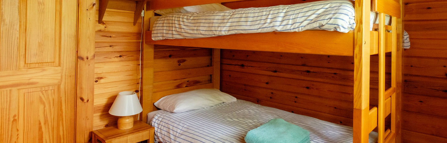 The house has 3 bedrooms (a double bedroom, twin bedroom and two full size bunk beds) sleeping 6. The kitchen is off the dining area and living room. There is a bathroom and separate shower room. At the front of the chalet is a veranda (with garden bench / table) giving access onto the garden which extends round the chalet.